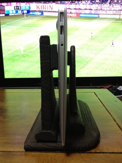 テレビとMacBook Airは、先ほどのMiniDisplayPort-HDMI変換ケーブルでつないでおいて、MacBook Airは自慢の自作スタンドに立てられてテレビの横に。